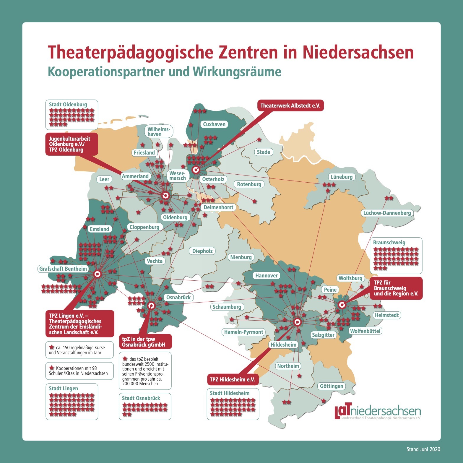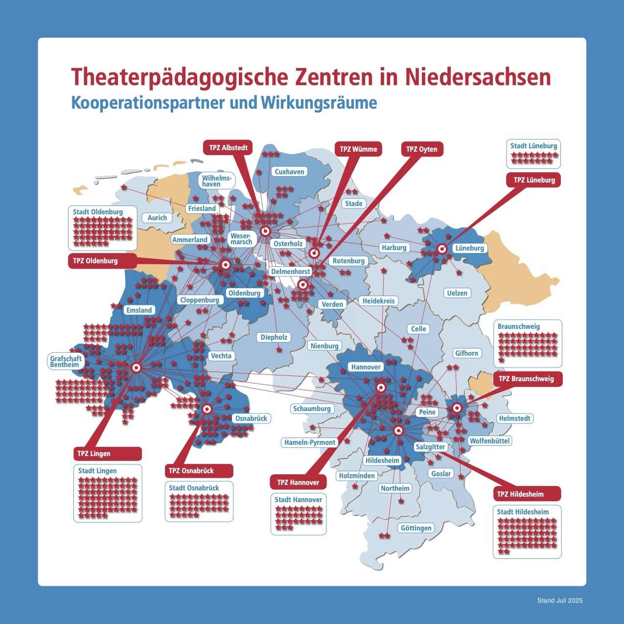 Der Landesverband Theaterpädagogik veröffentlicht 2025 die Broschüre „Theaterpädagogische Zentren in Niedersachsen – Kooperationspartner und Wirkungsräume“. Die Publikation veranschaulicht grafisch Wirken und Reichweite der zehn Theaterpädagogischen Zentren (TPZen). 2020 erschien die erste Ausgabe des Heftes. Da sich seitdem vier weitere Theaterpädagogische Zentren gegründet haben, wurden die Daten neu erhoben. Im Vergleich der Grafiken wird schnell sichtbar, dass inzwischen viel mehr Fläche durch theaterpädagogische Angebote bespielt wird.